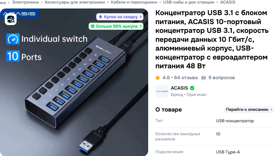 Подключаем к USB3 роутера ACASIS 10-портовый концентратор